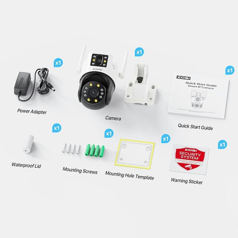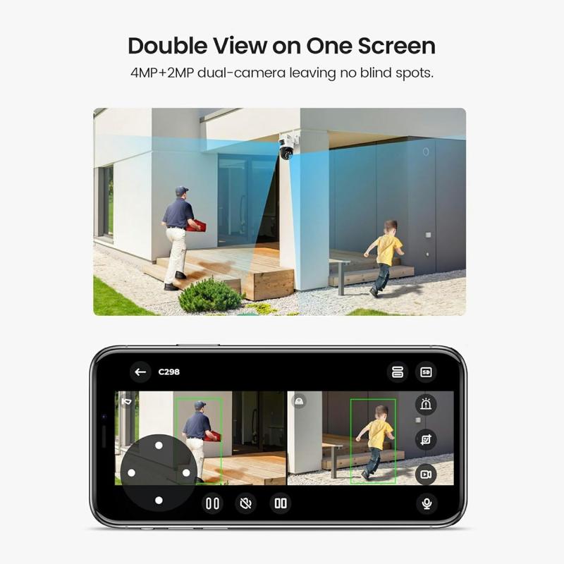 Beskyt indkørsler, haver og butiksfacader med 6 millioner pixels klarhed. ZOSI C298SE har to linser med 355° panorering, 140° hældning og AI-køretøjs- og humanoidsporing, så intet slipper forbi dens synsfelt - dag eller nat. Et vejrforseglet aluminiumshus, farvespotlight-tilstand og talk-back i realtid gør det til en professionel vagt, der installeres på få minutter på ethvert 2,4 GHz Wi-Fi-netværk.